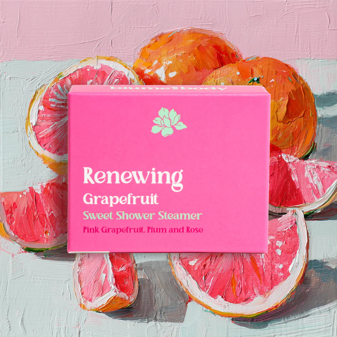 Renewing Grapefruit & Rose: A warm and sweet aroma essential oil shower steamer with fruity pink grapefruit, plum & rose