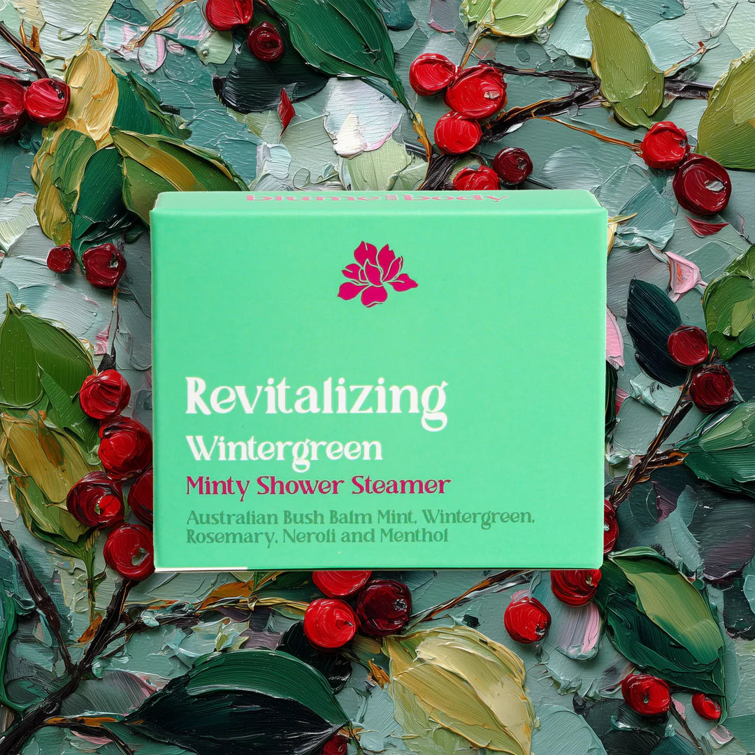Revitalizing Wintergreen: A mentholated fresh and warm aroma essential oil shower steamer with mint, wintergreen, rosemary and neroli notes.