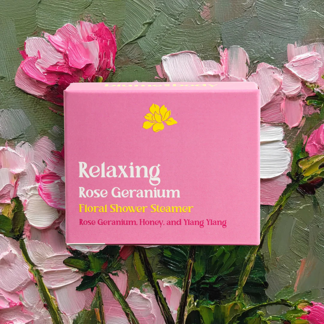 Relaxing Rose Geranium & Ylang:  A floral and sweet aroma essential oil shower steamer with warm rose geranium, honey and ylang ylang